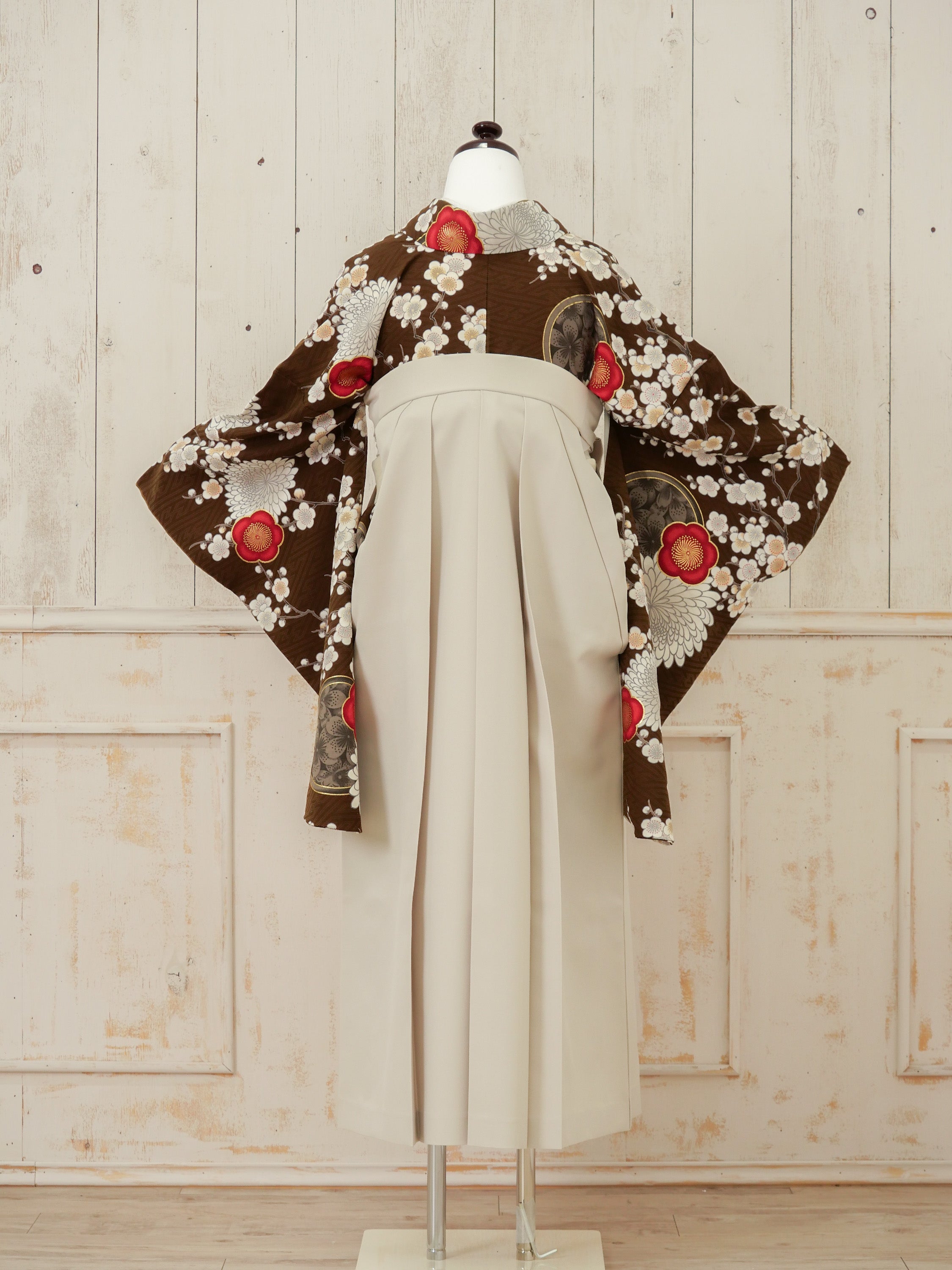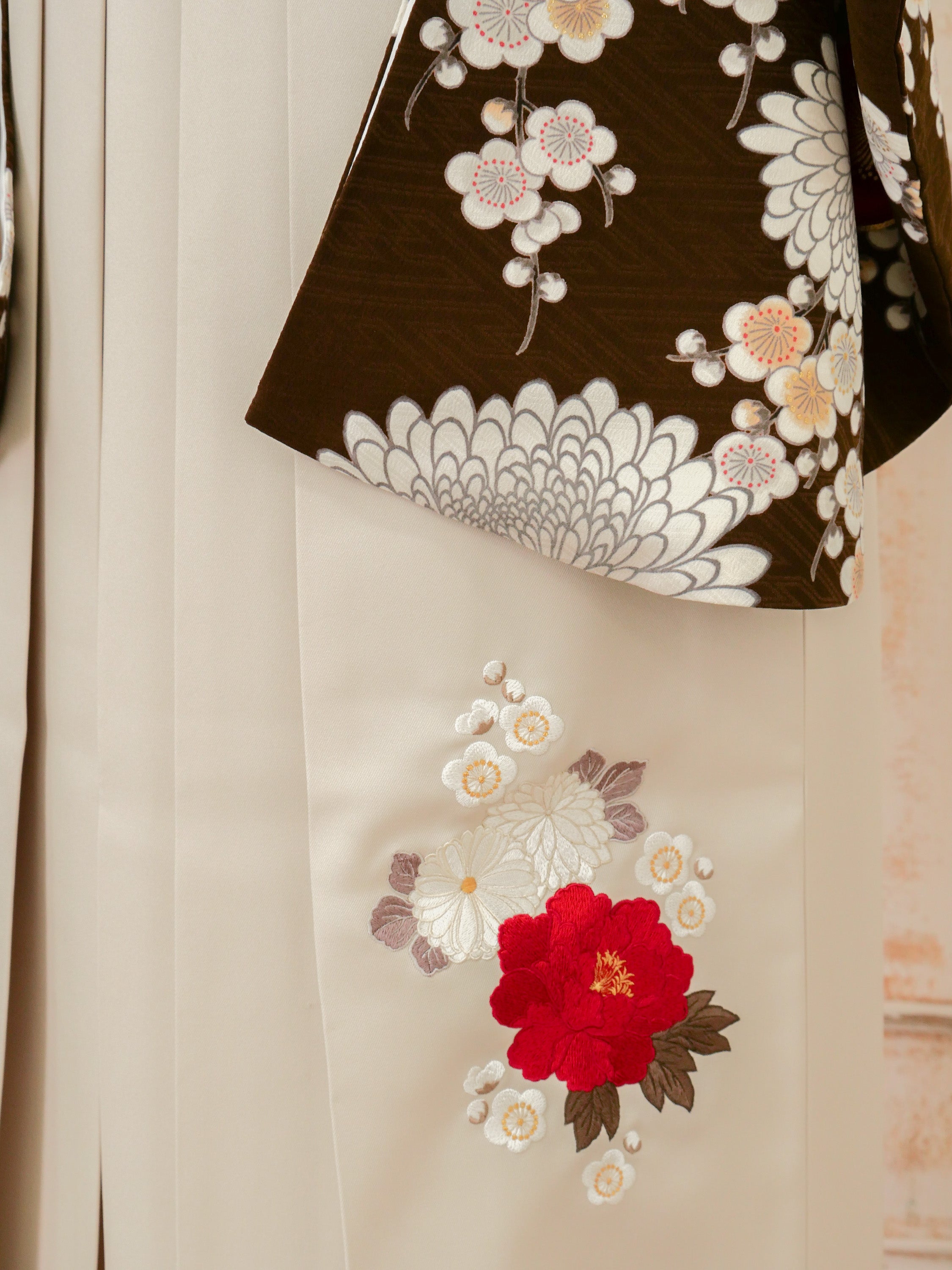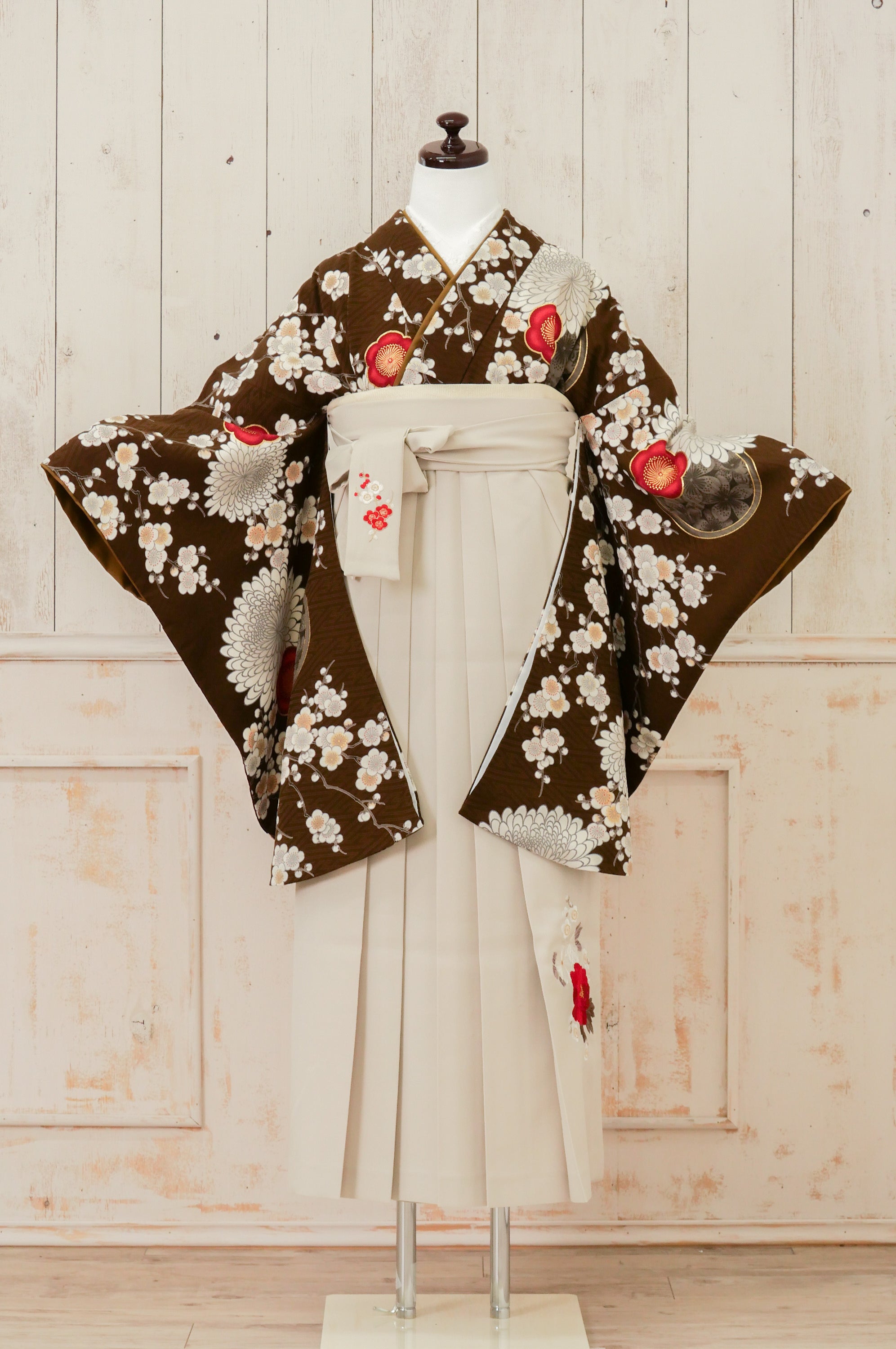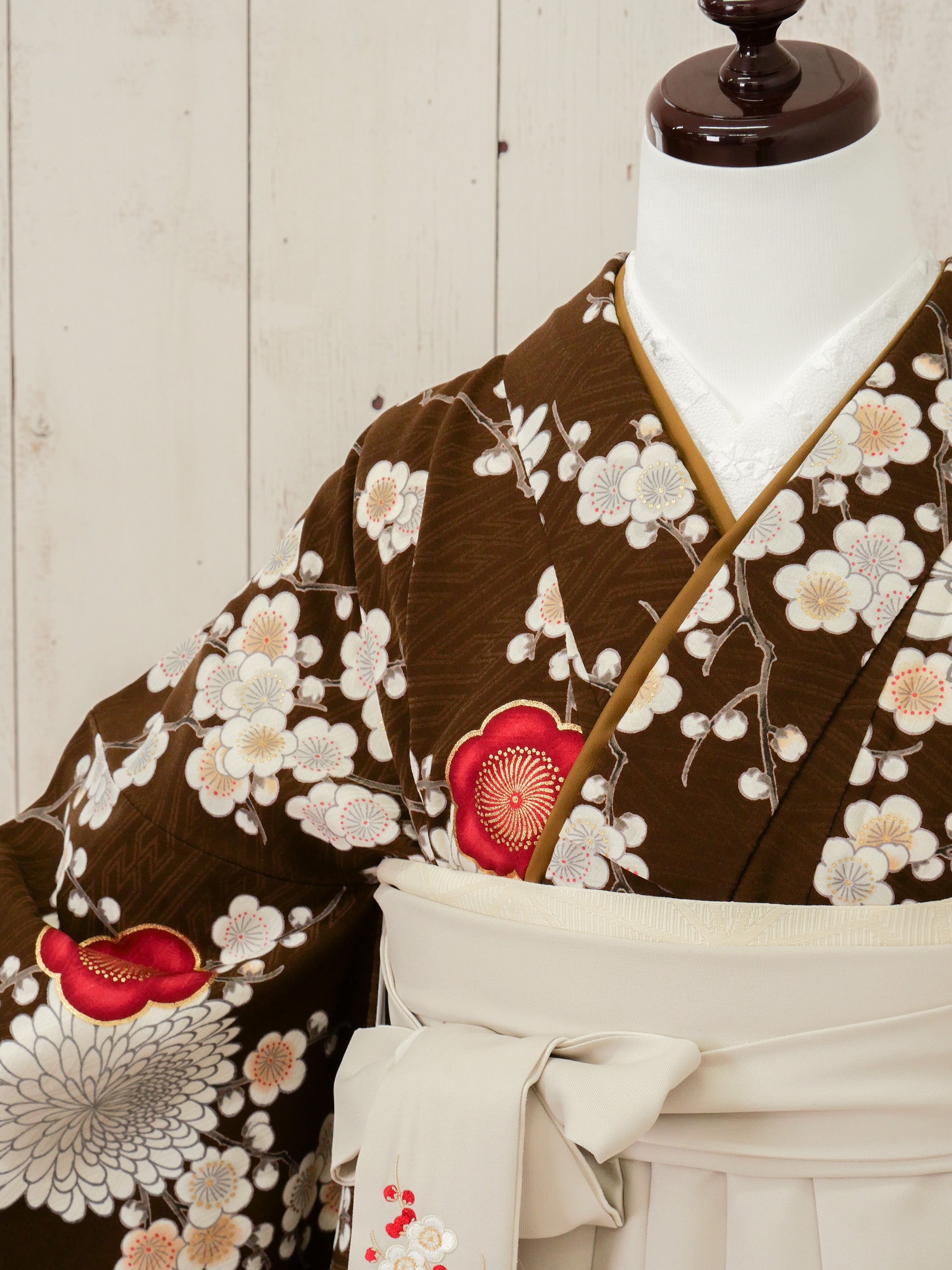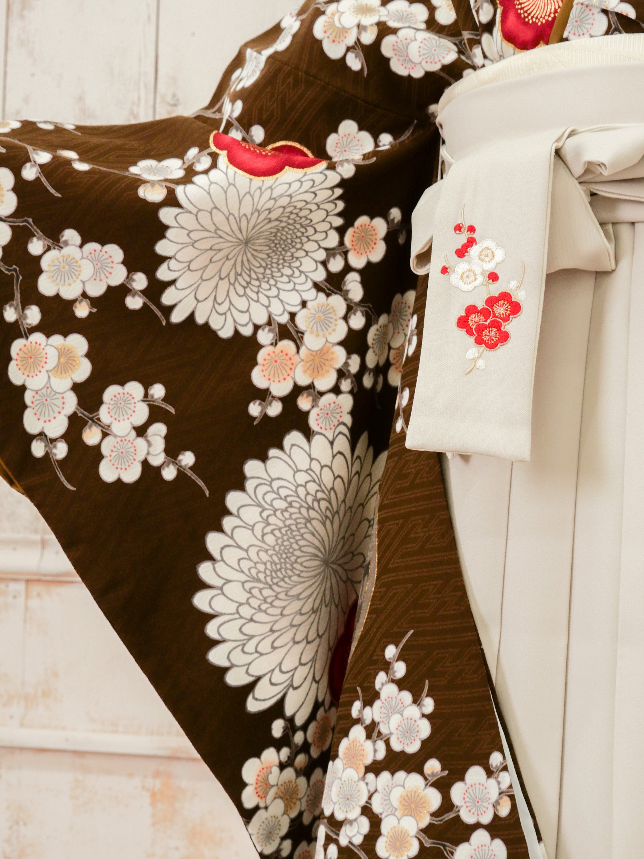 落ち着いたブラウン地に白梅と菊が咲き誇るモダンな一着。生成りの袴が上品さを引き立て、洗練された印象に。