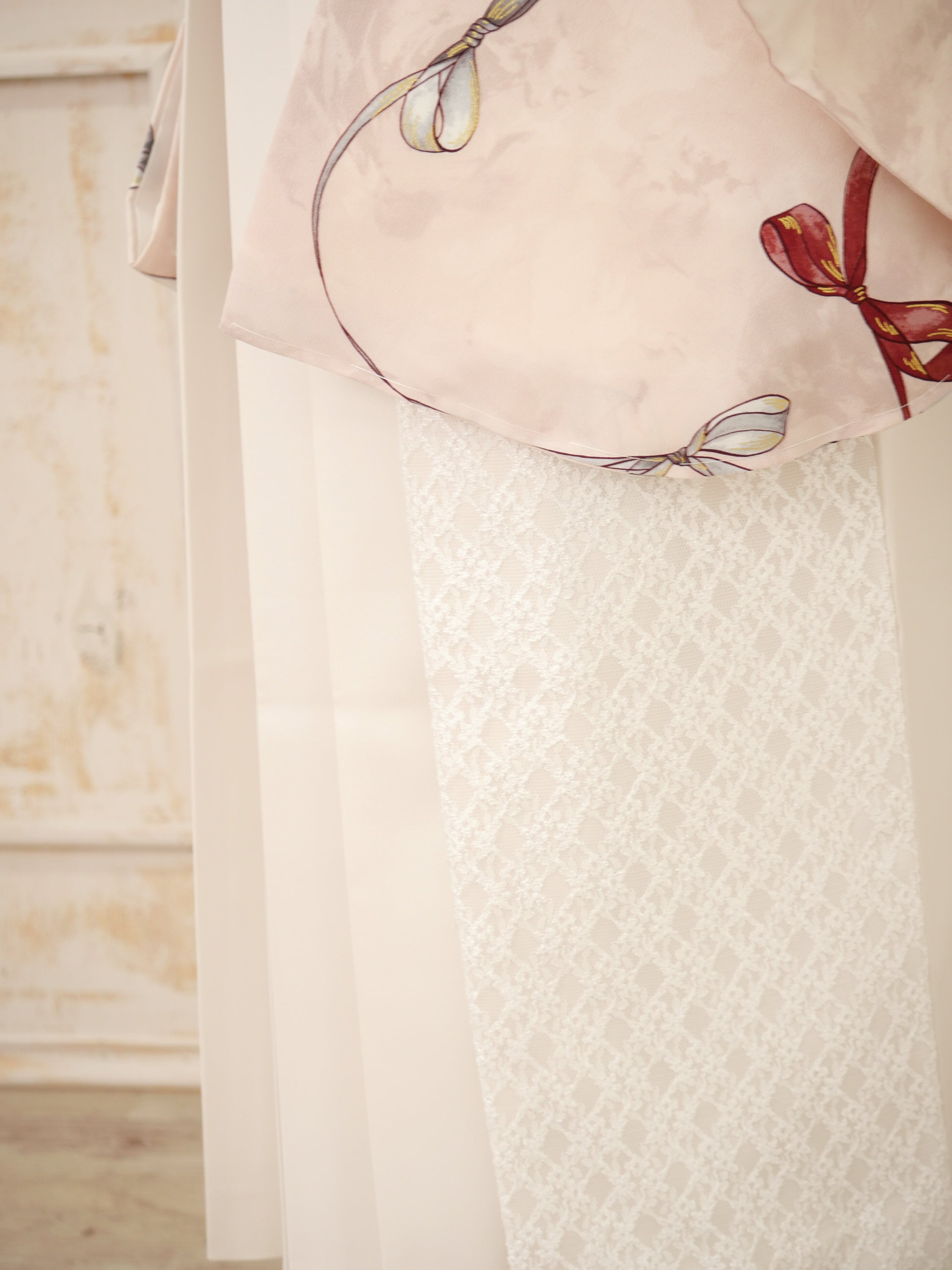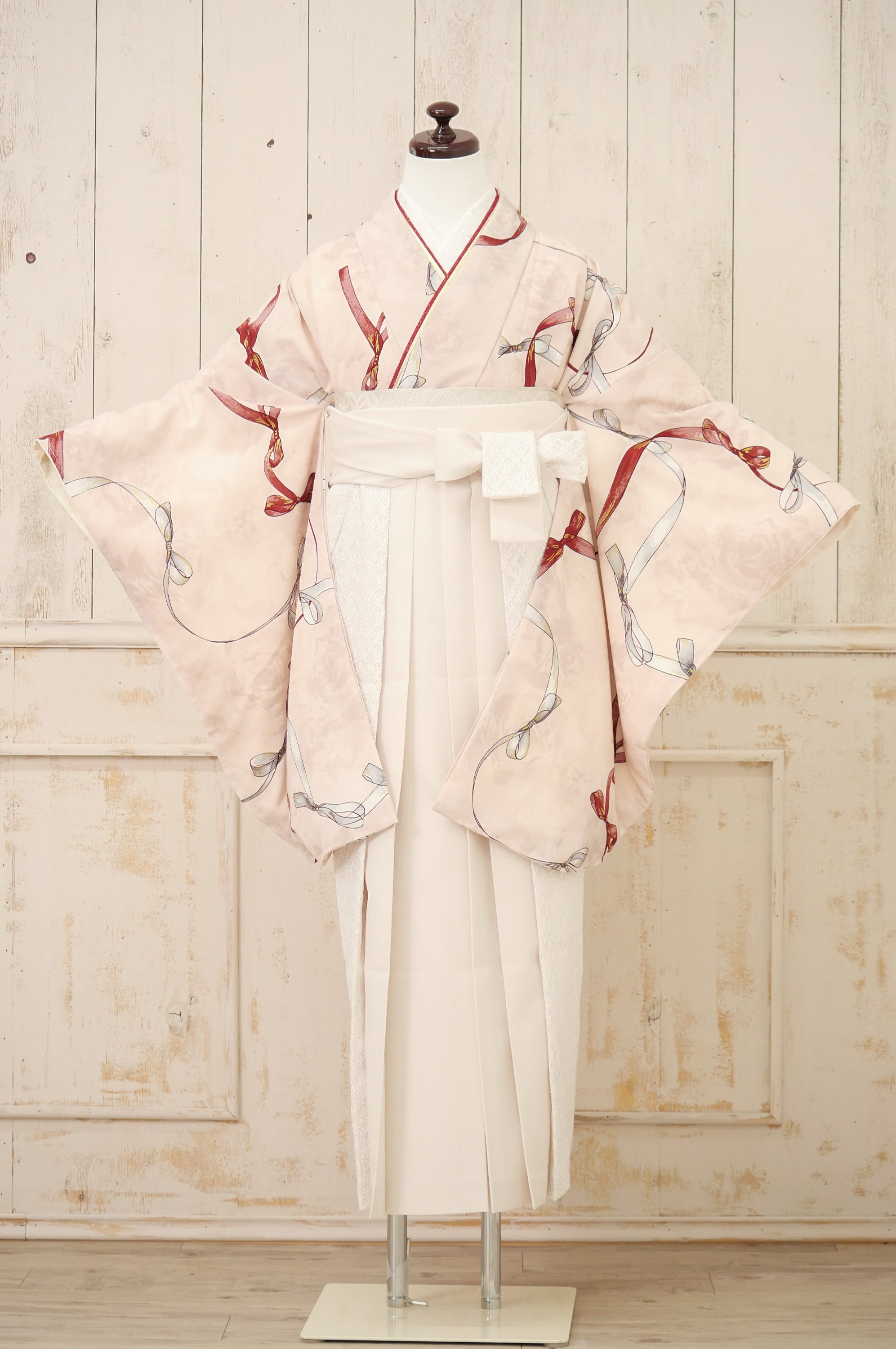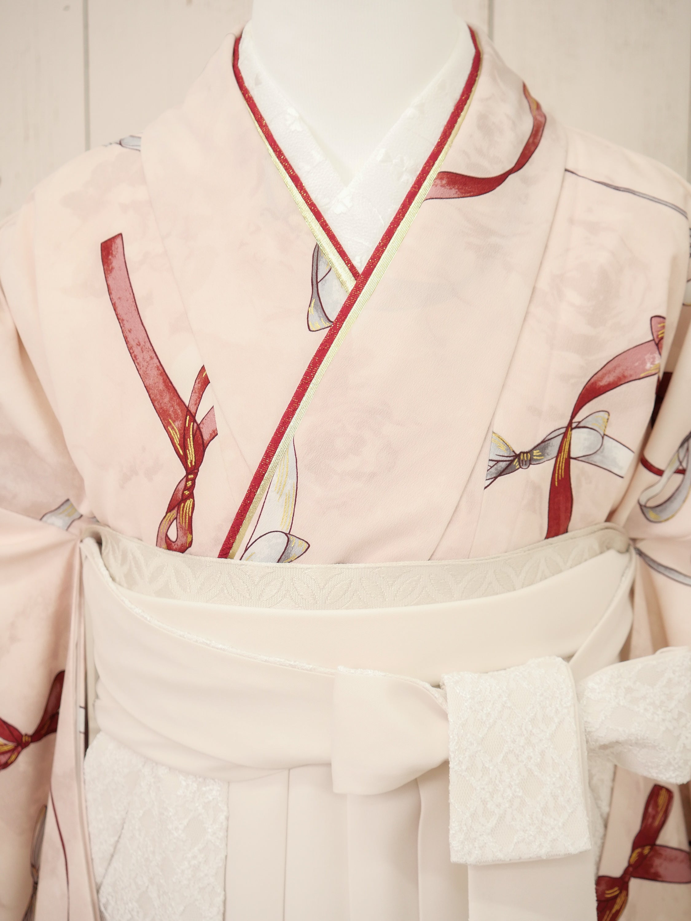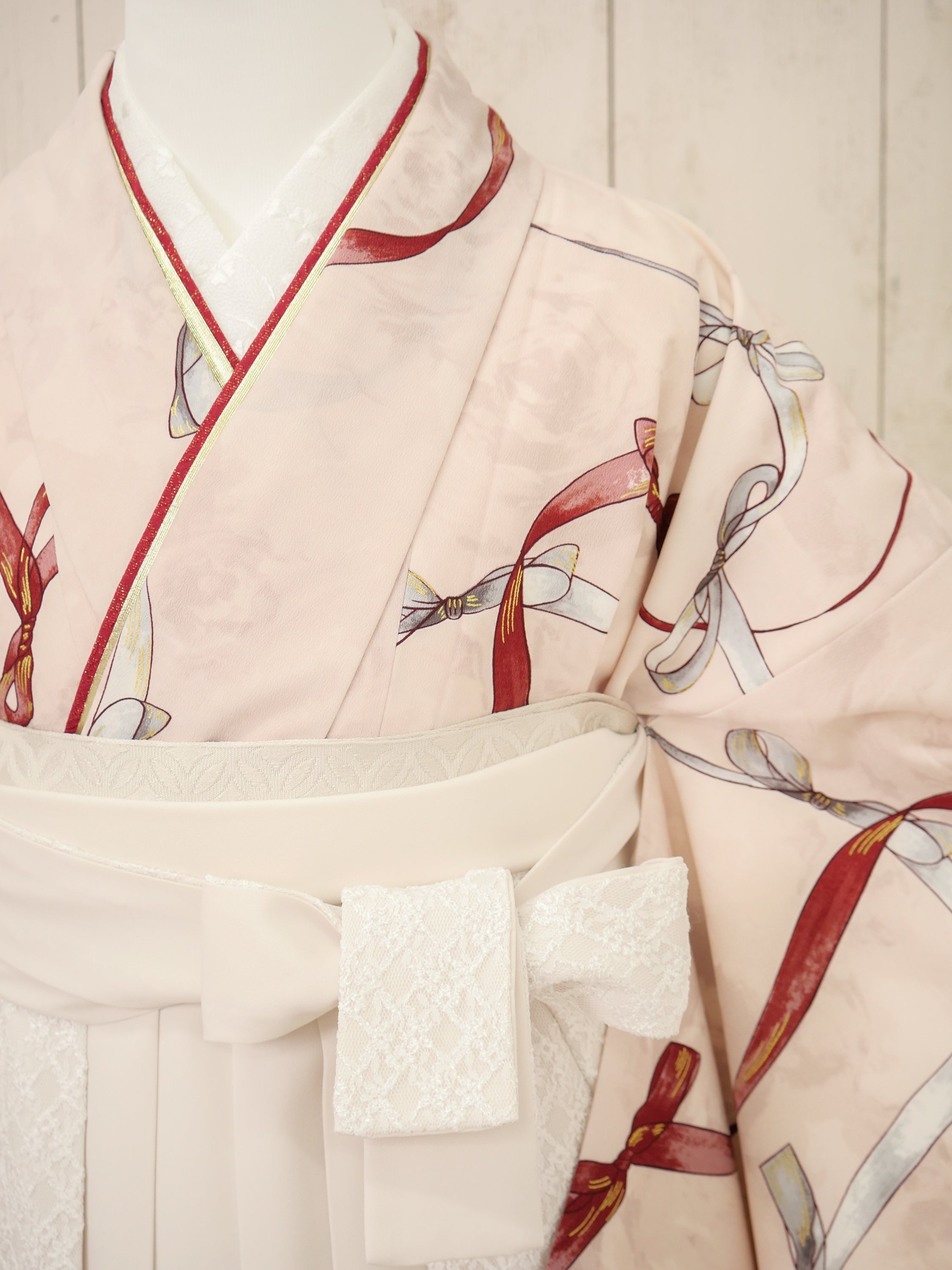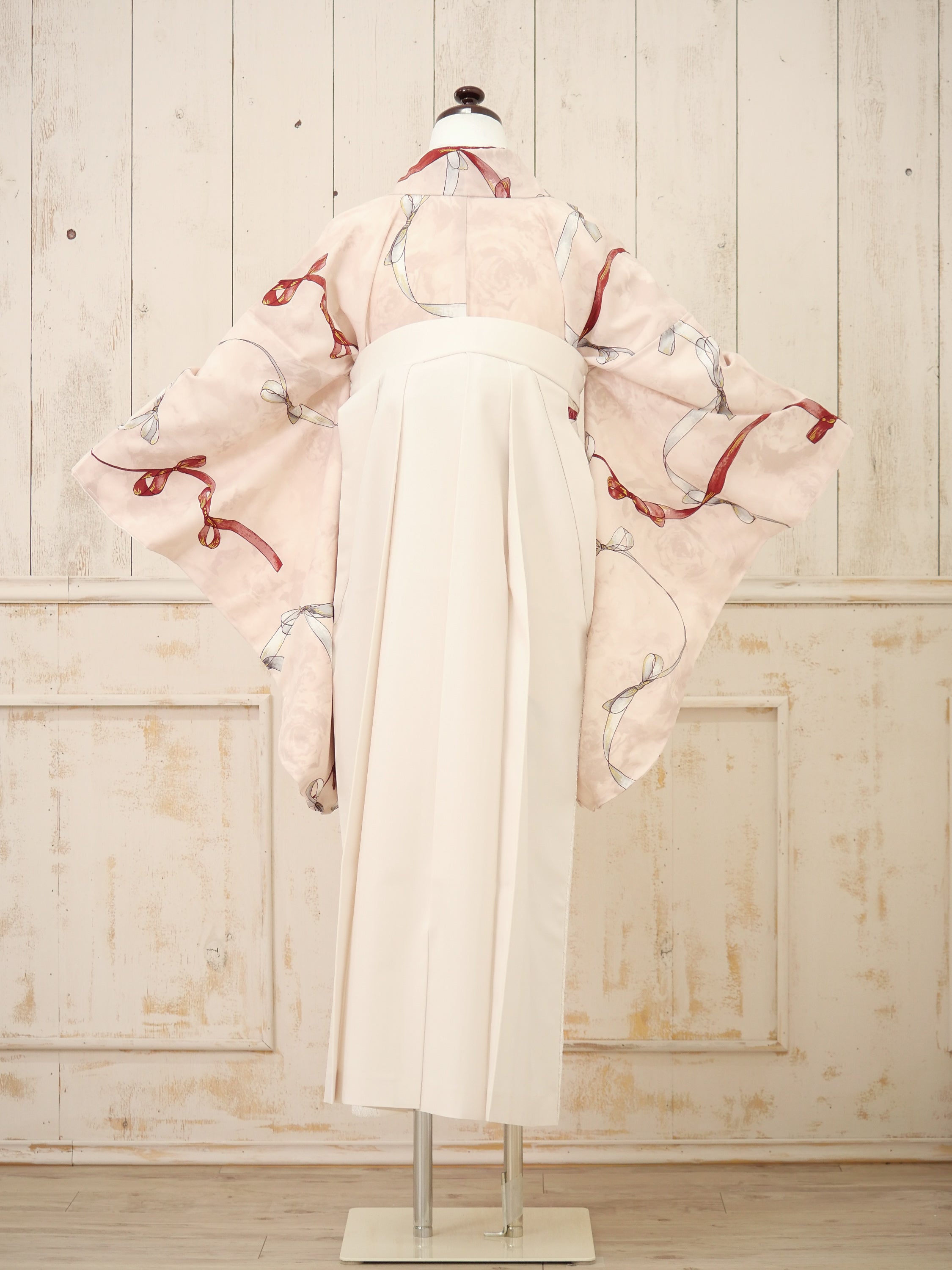 淡いピンク地にリボン柄が舞う、清楚で愛らしい袴スタイル。白の袴と合わせることで、柔らかく透明感のある印象に。控えめながらも個性が光る、卒業式にぴったりの一着です。