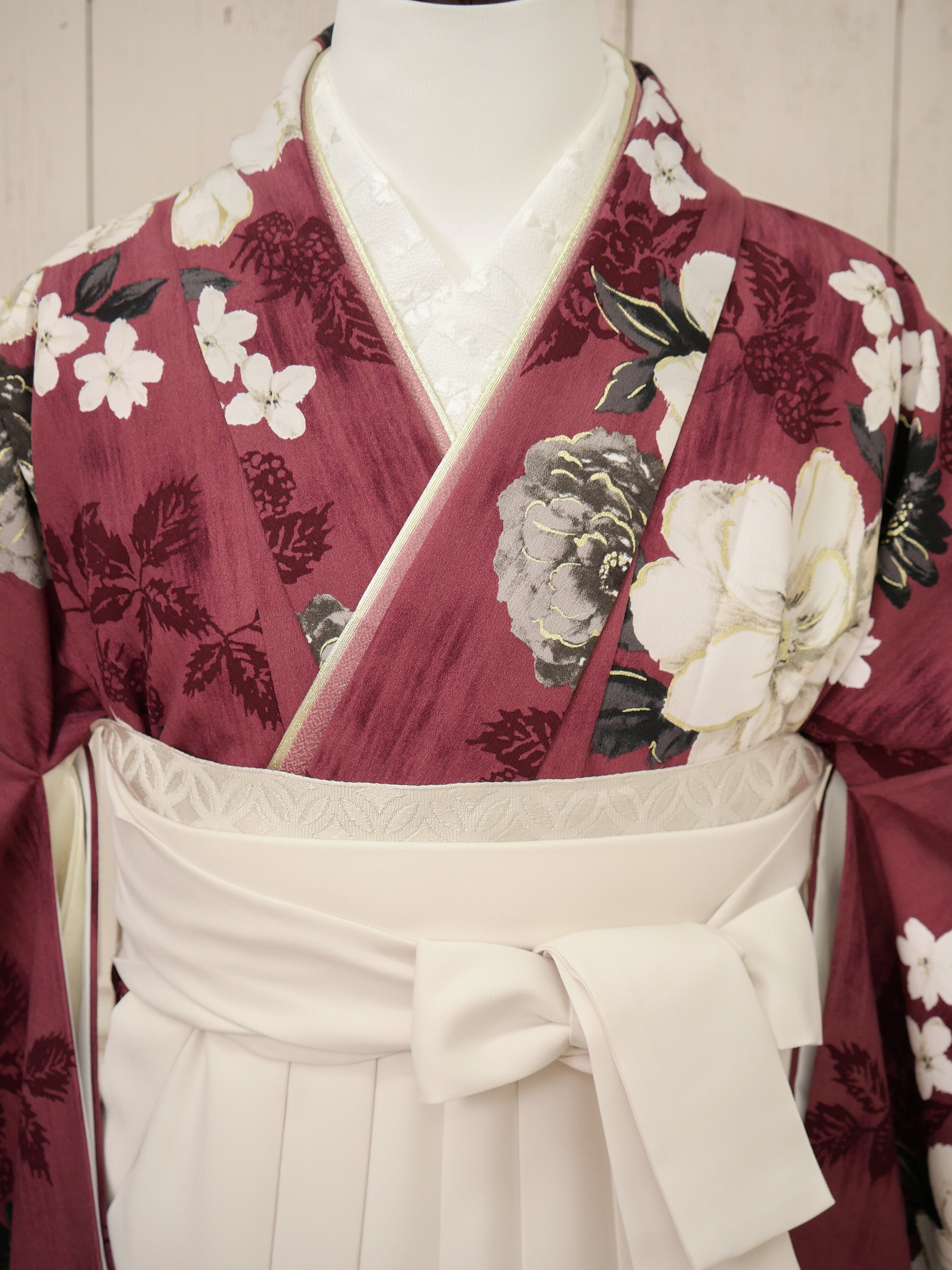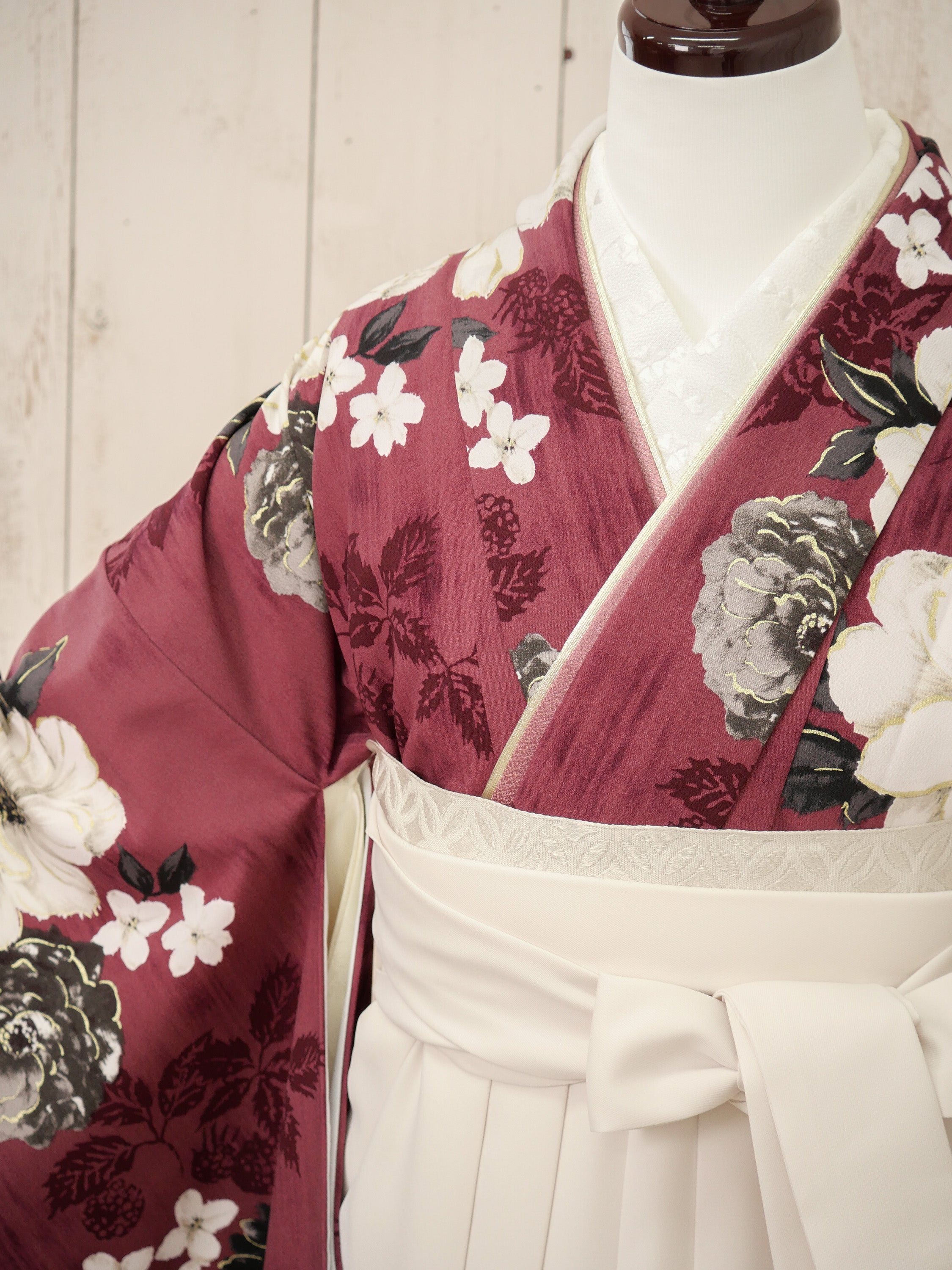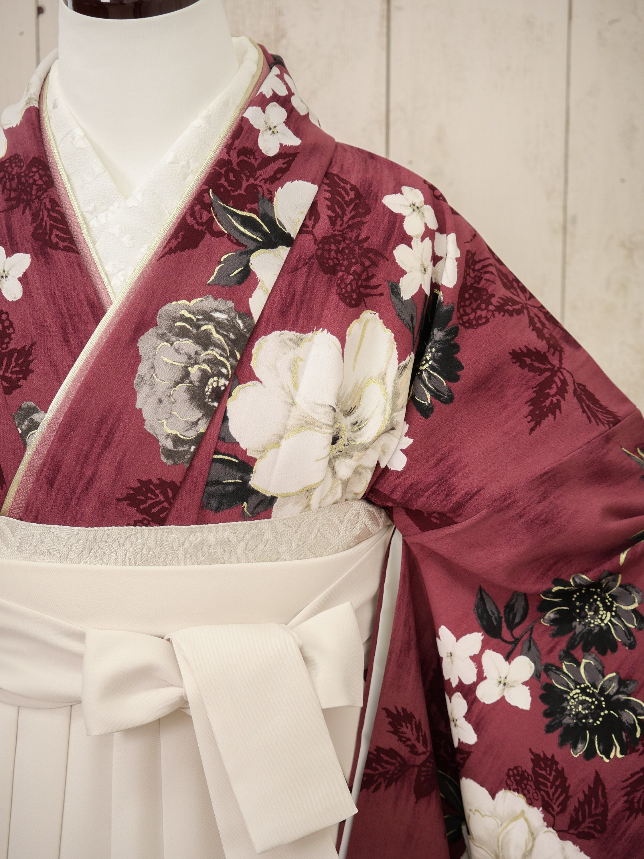 落ち着いたワインレッド地に大輪の白い花が映える、大人可愛い一着。アイボリーの袴が全体を軽やかにまとめ、優雅で華やかな印象に。上品さと華やかさのバランスが魅力です。